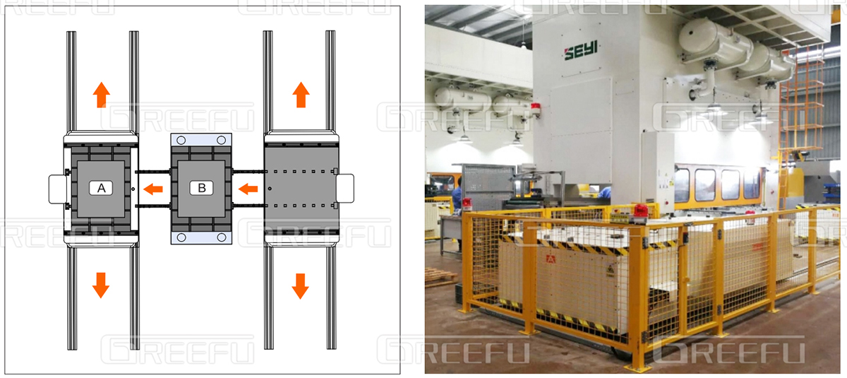 多臺沖床共用一套自動換模臺車系統(tǒng),該“自動換模臺車系統(tǒng)”能有效解決大型模具的換模作業(yè),如汽車鈑金、家電電梯等行業(yè)沖壓零件,且格萊富可依各種獨立作業(yè)需求研究開發(fā)各種搬運臺車,并可設(shè)計單鍵全自動或半自動對模具的搬入搬出,同時,現(xiàn)在該模具輸送系統(tǒng)也已逐漸被業(yè)內(nèi)接受與采用,尤其是,汽機車零組件等需大型模具的制造業(yè)等。