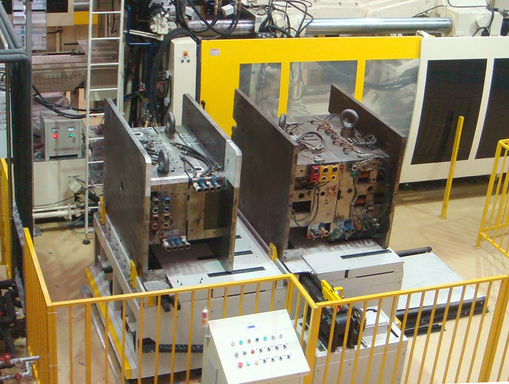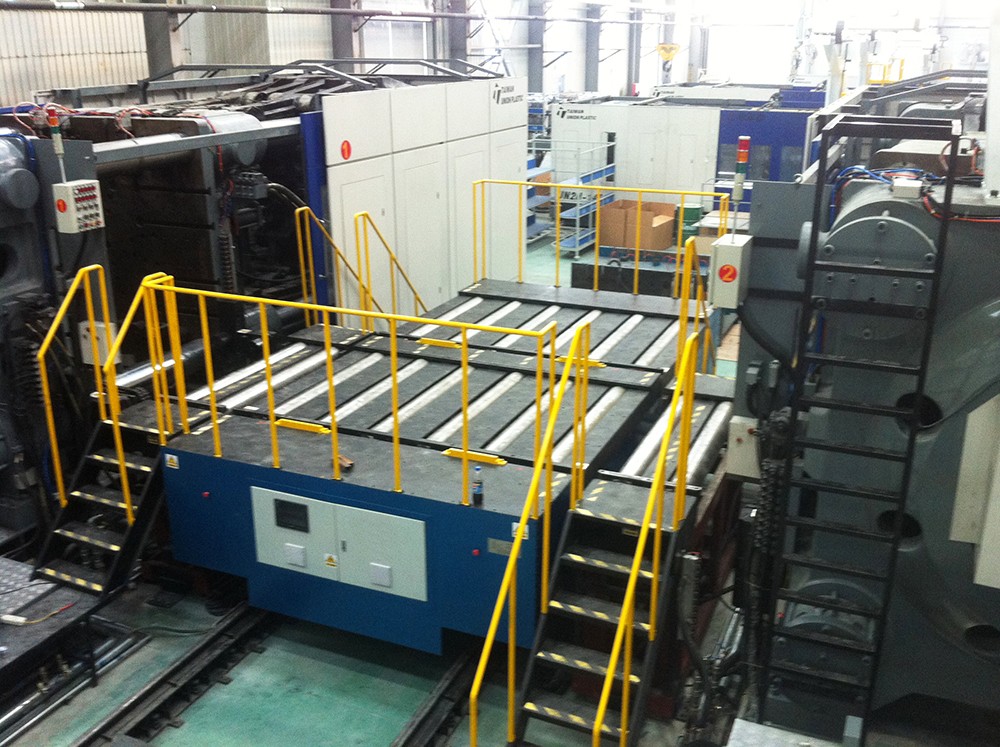 多臺(tái)注塑機(jī)共用一套自動(dòng)換模臺(tái)車系統(tǒng),該“自動(dòng)換模臺(tái)車系統(tǒng)”能有效解決大型模具的換模作業(yè),如汽車鈑金、家電電梯等行業(yè)沖壓零件,且格萊富可依各種獨(dú)立作業(yè)需求研究開(kāi)發(fā)各種搬運(yùn)臺(tái)車,并可設(shè)計(jì)單鍵全自動(dòng)或半自動(dòng)對(duì)模具的搬入搬出,同時(shí),現(xiàn)在該模具輸送系統(tǒng)也已逐漸被業(yè)內(nèi)接受與采用,尤其是,汽機(jī)車零組件等需大型模具的制造業(yè)等。